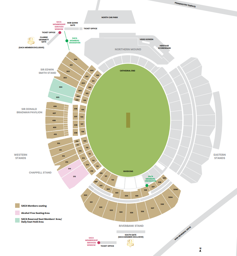 For men’s international match days in the 2025/26 season, Full, Country and Junior SACA Members and their guests can select an available seat in the Chappell Stand, Sir Donald Bradman Pavilion and the Sir Edwin Smith Stand (western stands), as well as Level 3, Level 5 and sections of Level 1 of the Riverbank Stand.